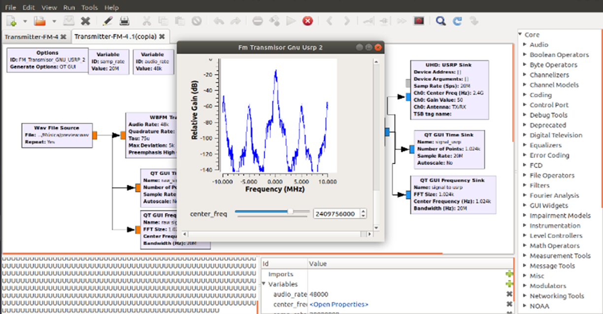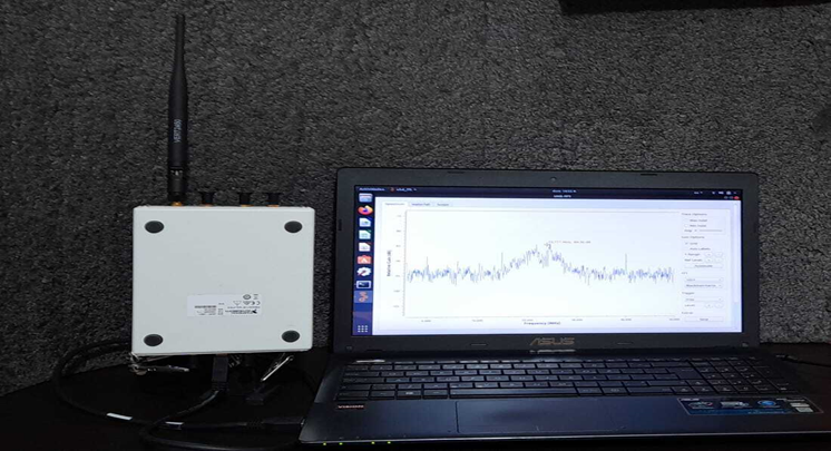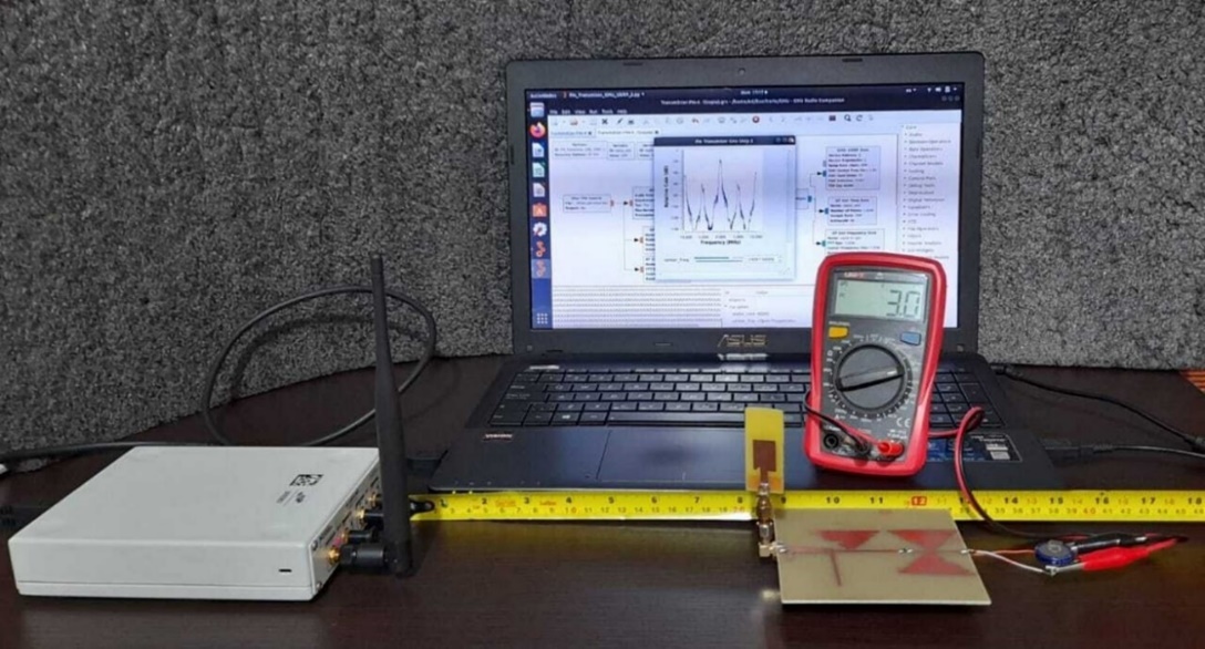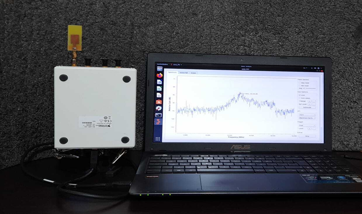 Antes de realizar la captación de energía RF, se realiza una prueba de comparación de medidas de potencia Figura 8, se ejecuta un programa en GNU Radio utilizando la tarjeta NI USRP-2901, para ver el espectro y detectar la intensidad de señal recibida por la antena propuesta contra una antena de referencia comercial, la antena monopolo guía VERT2450 de doble banda 2.4 GHz a 2.5 GHz y 4.9 GHz a 5.9 GHz, es una antena omnidireccional con una ganancia de 3 dBi, esta antena es utilizada en los puntos de acceso inalámbricos (AP) según el estándar 802.11b/g/n. El procedimiento anterior se repite utilizando la antena propuesta como se observa en la Figura 9.