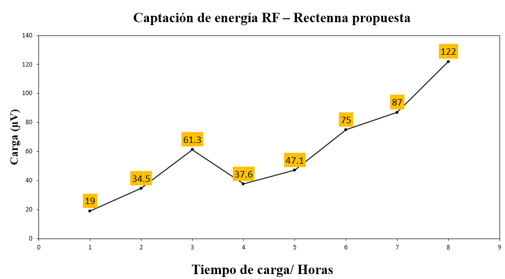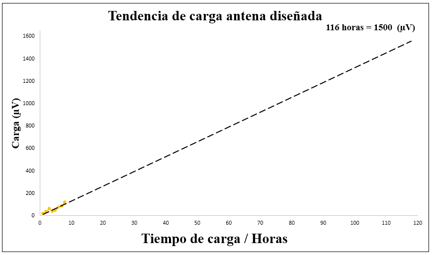 En la Figura 12, se presentan los resultados obtenidos del proceso de captación de energía inalámbrica, la rectenna se expone durante un tiempo de 8 horas frente al transmisor, esta inicialmente presenta una carga de 20 microvoltios y finaliza con una carga de 122 microvoltios. La Figura 13, presenta una estimación de 116 horas para que la rectenna logre rectificar 1500 microvoltios suficientes para encender un led convencional.