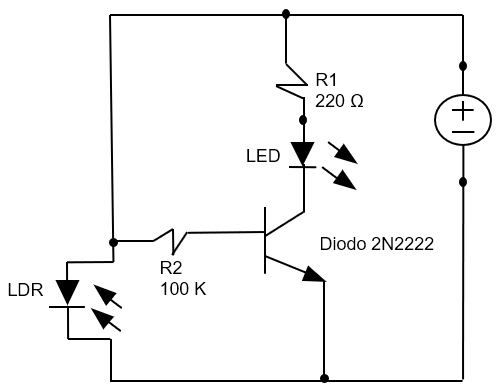 Para verificar la utilidad de la rectenna se diseña un sencillo sensor detector de oscuridad que utiliza un diodo 2N2222, un diodo led, una resistencia de 220 Ω, además, de una foto-resistencia como se presenta en la Figura 14.
