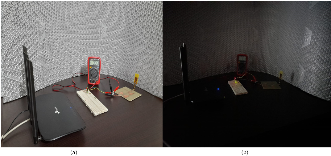 Con el objetivo de lograr la captación de energía de RF en un ambiente real, se utiliza un router inalámbrico tp-link modelo: TL-WR940N con un ancho de canal de 20 MHz para transmitir frecuencias en 2.40 GHz y 5.0 GHz Wi-Fi, como se muestra en la Figura 15a. Inicialmente, el router y la antena propuesta están separadas a 1 metro de distancia, esta distancia fue disminuyendo hasta llegar a 30 cm donde se pudo lograr la captación de energía de RF evaluada en un tiempo de carga de 120 horas seguidas como se observa en la Figura 15b.