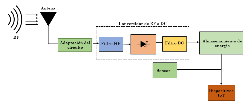 Las aplicaciones donde se incluyen redes de sensores inalámbricos, dispositivos autoalimentados e internet de las cosas (IoT), tienen la necesidad de recolectar energía para así, dar solución a problemas de carga, el mantenimiento en los sistemas de baterías y también para reducir el uso de estas ya que, contaminan el ambiente [1]. En el medio ambiente se encuentran fuentes de energía que pueden suplir necesidades de carga elementales como la energía solar (100 mW/cm2), energía por vibración (200 µW/ cm2), energía térmica (60 µW/ cm2) y la energía de radio frecuencia (RF) (1 µW/ cm2) [2]. También se puede reciclar la energía electromagnética proveniente de la televisión digital [3], [4] las estaciones móviles [5]-[7] y las señales de Wi-Fi [8], [9]. Las antenas con patrón de radiación omnidireccional son de gran utilidad para mejorar el sistema WPT (Wireless Power Transfer, por sus siglas en inglés) ya que la antena captura energía de varias direcciones, igualmente es necesario un circuito rectificador para realizar la conversión de energía RF (Radio Frequency, por sus siglas en inglés) a corriente continua (CC), la combinación de una antena y un circuito rectificador se conoce como Rectenna [10]-[12]. La integración de estos dos elementos es fundamental para dicho sistema debido a que, determina la calidad y la eficiencia de un sistema recolector de energía RF [13]. La Figura 1 presenta el diagrama de bloques de un sistema recolector de energía RF.