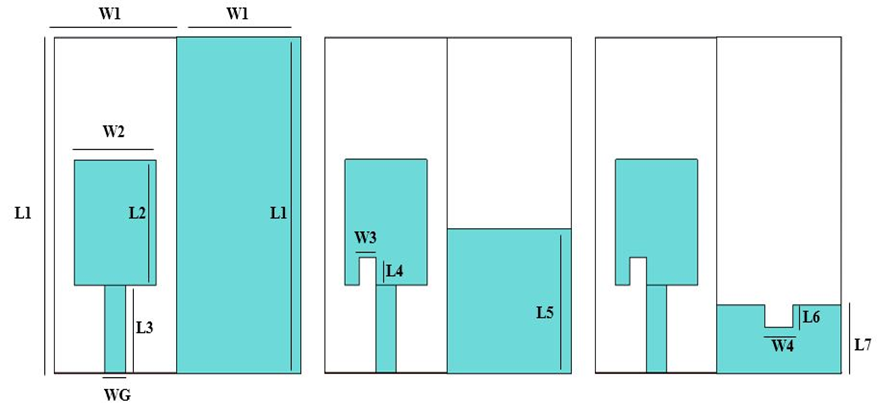 En la Figura 2 se presenta el proceso de diseño de la antena monopolo propuesta. Inicialmente se presenta la antena con plano de tierra completo luego, se recorta el plano de tierra para mejorar el patrón de radiación, finalmente en el plano de tierra se realiza una inserción de ranura al igual que, en el parche radiante para ajustar a la frecuencia deseada.