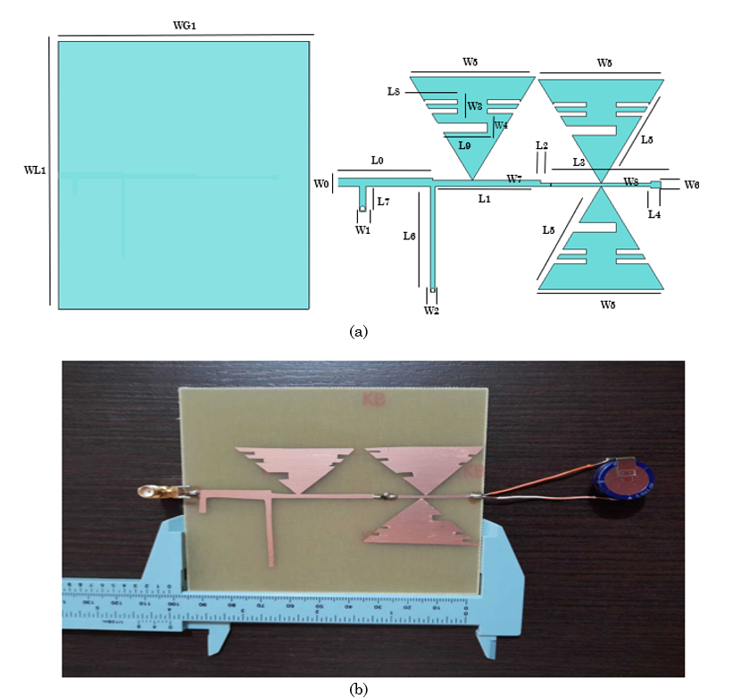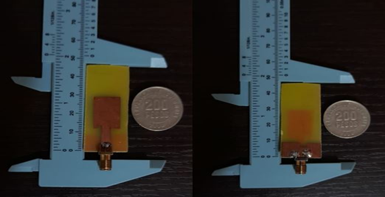 La antena propuesta está fabricada sobre un substrato FR4 de bajo costo con una permitividad relativa εr de 4.4, tangente de pérdida de 0.02 y un espesor (h) de 1.6 mm. El tamaño total de substrato es de 18 mm × 44 mm, con frecuencias de resonancia en 2.45 GHz, 5.38 GHz. La línea de alimentación se realiza por medio de una guía de onda coplanar (CPW) con impedancia de 50 Ω, esta línea de transmisión es utilizada para excitar el parche radiante de la antena. Se realizan dos ranuras rectangulares una en el parche radiante, la otra ranura se realiza en el plano de tierra. Estas ranuras generan diferentes frecuencias de resonancia ayudan en la sintonización de estas y también mejoran el patrón de radiación [20]-[23].