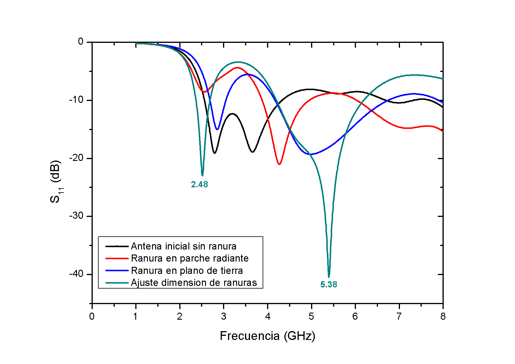 En la Figura 4 se observa el desplazamiento que presenta el coeficiente de reflexión (s11) provocado por la inserción de ranuras durante el proceso de diseño de la antena propuesta. Las ranuras insertadas fueron cambiando de posición y de dimensión hasta obtener las frecuencias deseadas con un buen ancho de banda.