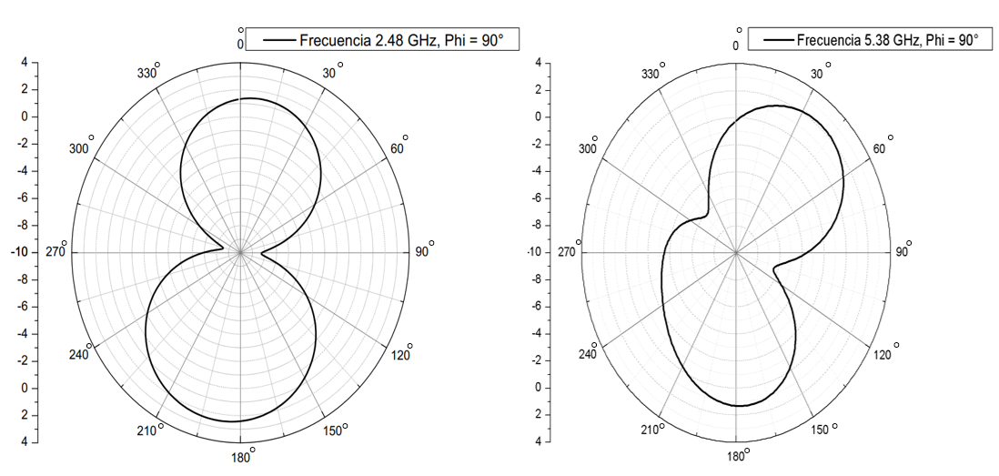 En la Figura 5 se observan los diagramas de radiación en coordenadas polares de las frecuencias 2.48 GHz y 5.38 GHz, presentando una forma bidireccional con lóbulos opuestos. Estos lóbulos emiten o reciben energía tanto por delante como por detrás, esta característica favorece la captura de energía inalámbrica desde varios ángulos. En la Tabla 1 se presentan los parámetros de las dimensiones de la antena propuesta.