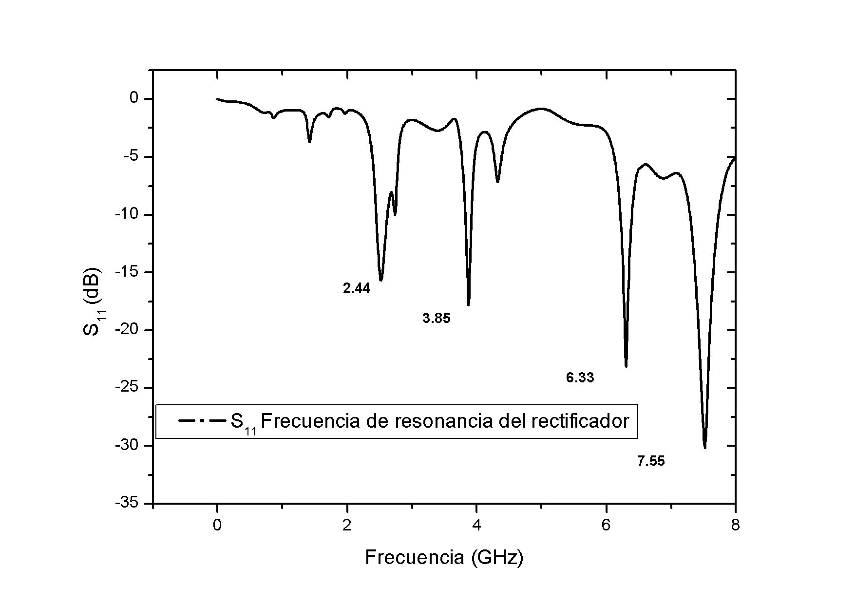 Los parámetros de la Figura 6a en mm son: L0 = 28.7, L1 = 35, L2 = 3.05, L3 = 30.25, L4 = 3, L5 = 37.41, L6 =33.80, L7 = 8, L9 = 14.55, WL1 = 10, W0 = 2.64, W1 = 2, W2 = 1.4, W3 = 1.5, W4 = 3, W5 = 38.11, W6 = 2.20, W7 = 2.20, W8 = 1.5, WG1 = 10. En la Figura 6b se presenta el rectificador diseñado y la simulación de los coeficientes de reflexión se presenta en la Figura 7. La simulación presentó como resultado las frecuencias de operación en 2.52 GHz, 3.85 GHz, 6.33 GHz y 7.55 GHz. El diseño del rectificador está basado en una red de adaptación de impedancia con una línea de transmisión en forma de T y con inserción de un diodo Schotkky HSMS-286C el cual es adecuado para aplicaciones de baja potencia con un umbral de ruptura entre 0.15 V y 3.8 V [35]. El filtro de paso para la corriente continua está compuesto por tres figuras triangulares con iguales dimensiones e igual número de ranuras en forma de cascada para optimizar el diseño y lograr desplazar la frecuencia fundamental a la frecuencia de operación deseada. La simulación también se realiza con el software CST Studio.