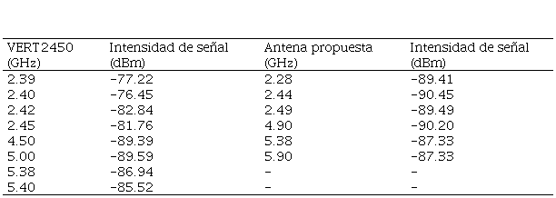 En la Tabla 2 se puede apreciar que la intensidad de señal recibida por la antena propuesta se asemeja a la señal de intensidad recibida por la antena guía, esto indica que la antena propuesta tiene buenas cualidades para operar a las frecuencias medidas.