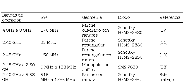 Finalmente, en la Tabla 4 se presenta una comparación entre diferentes investigaciones sobre rectennas y la rectenna propuesta en este documento.