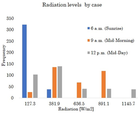 As shown in Figure 2, the radiation level is different in every case, at sunrise, a high frequency of occurrence on low radiation values (127.3 W/m2) and low frequency on high radiation levels can be observed.
