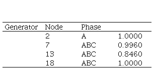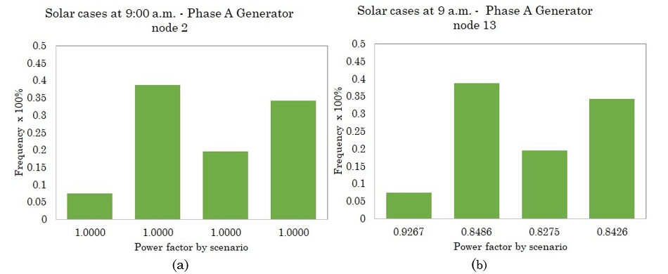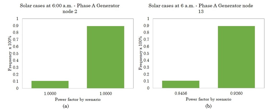 This case was evaluated at 6:00 a.m. with a computational time of 11.0507 seconds. Here, the radiation level is low, and, as shown in Figure 2, the amount of data can only represent the first two of the five radiation scenarios. In Figure 3, graphs (a) and (b) plot the possible power factors for generation units 1 and 3 as an outcome of the optimization algorithm. The number of power factors presented on the graphic is related to the level of radiation and the frequency of occurrence obtained at sunrise (two scenarios: 127.3 W/m2 and 381.9 W/m2). Table 1 presents the result of (13), which represents the sum of the power factors by their frequency of occurrence, which yields the result of the expected value of the PF for each solar generation inverter unit. This value will be adjusted in the inverters to ensure an efficient operation of the network at that hour of the day. Most of the PV generation nodes were set to one, except on node 13, in which the power factor is lower than one. This represents a reactive power current flowing from the PV inverters to the grid to supply the needs of reactive power near the node 13.