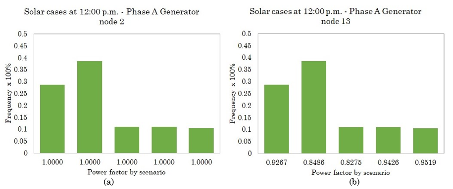 This case was evaluated at 12:00 p.m. with a computational time of 11.5454 seconds. In this case, the radiation level is higher than in cases 1 and 2. As shown in Figure 2, the amount of data was enough to fit all the five proposed scenarios. In Figure 5, graphs (a) and (b) plot the possible power factors for generation units 1 and 3 as an outcome of the optimization algorithm. The number of power factors presented in the graph are related to the level of radiation and the frequency of occurrence obtained at midday (five scenarios: 127.3 W/m2, 381.9 W/m2, 636.5 W/m2, 891.1 W/m2, and 1145.7 W/m2). Table 3 presents the result of (13), which represents the sum of the power factors by their frequency of occurrence, thus yielding the result of the expected value of the PF for each solar generation inverter unit. This value will be adjusted in the inverters to ensure an efficient operation of the network at that hour of the day. As in the previous case, the sources connected to nodes 7 and 13 reduce their power factor because of more oversized loads and due to the fact that they are connected near said generation nodes, so their PF is altered since it must supply the necessary reactive power to feed the load.