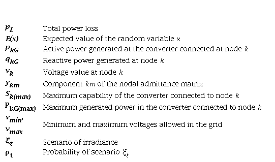 Where (3) is a convex function that represents the expected losses of the network, (4) are non-linear and non-convex equations that represent the active and reactive power flow constraints, respectively, (5) is the maximum and minimum voltage of the grid, (6) is the capability of the converter, and (7) is the maximum power that can be generated in each node.