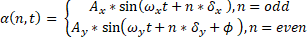 Where n is the motor number, Ax and Ay are the wave amplitudes, δx and δy is the spatial frequency, ωx and ωy represents the temporal frequency, and ϕ is the phase difference between the sine waves in the horizontal and vertical plane.
