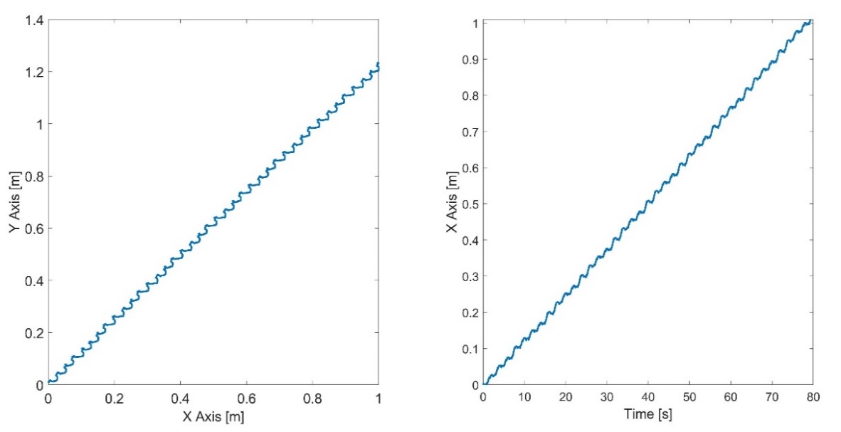 From the previous figure, it can be observed that the robot does not have a full rectilinear behavior, presenting a slight deviation to the right of 8.9 mm on the Y-axis, which is insignificant in the short runs. The simulation time in each of the tests that the robot took to reach 1.5 m was 60.064 s, obtaining a speed of 2.49 cm/s.