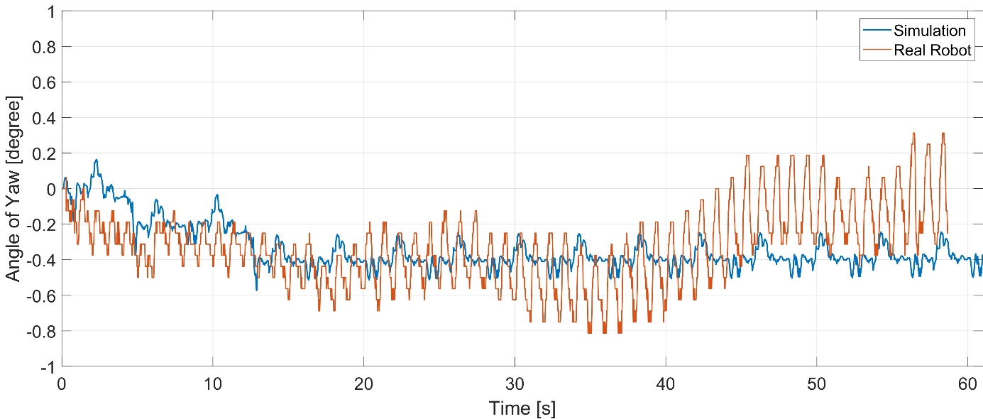 Figure 12 presents a graph comparing the simulated values with the experimental values of the Yaw angle recorded by the IMU located in the robot’s head. Notice that sidewinding motion is a three-dimensional gait mode in which two sinusoidal waveforms interact to generate alternating forward/backward and left/right movements. The figure shows the horizontal movements of the head, where angles ranging in the simulation range from 5° to -10° are obtained. Even, up to 50 seconds there is a great similarity in the comparison of results, then, the angle readings on the actual robot may be affected due to the noise generated by the stress when the external power supply starts to crawl, changing the initial state of the reading of the three IMU rotation axes.