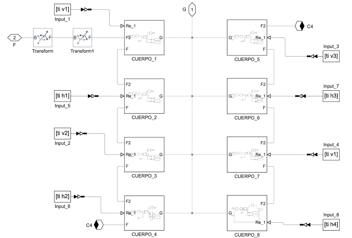 The above diagram is decomposed into several blocks. To determine the global reference frame of the model, the block (World frame) is used, and a 6-degree-of-freedom (6-DOF-1) joint is implemented, which represents the virtual orientation and positioning structure discussed in section 2.1. This joint establishes the initial position of the robot concerning the global reference of the system. Within the Robot block in Figure 2, the eight bodies, the tail, and the head of the robot are represented, which are connected to each other (see Figure 3).