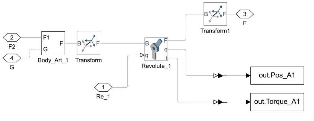 Additionally, some blocks called (Transform) can be observed, where the rotations and translations of the axes of each link are specified, which correspond to the kinematic solution presented in Figure 1. The body blocks inside each contain a rotational joint and a linkage position and torque signal output (Figure 4). In addition, the body block_1 contains the robot head.