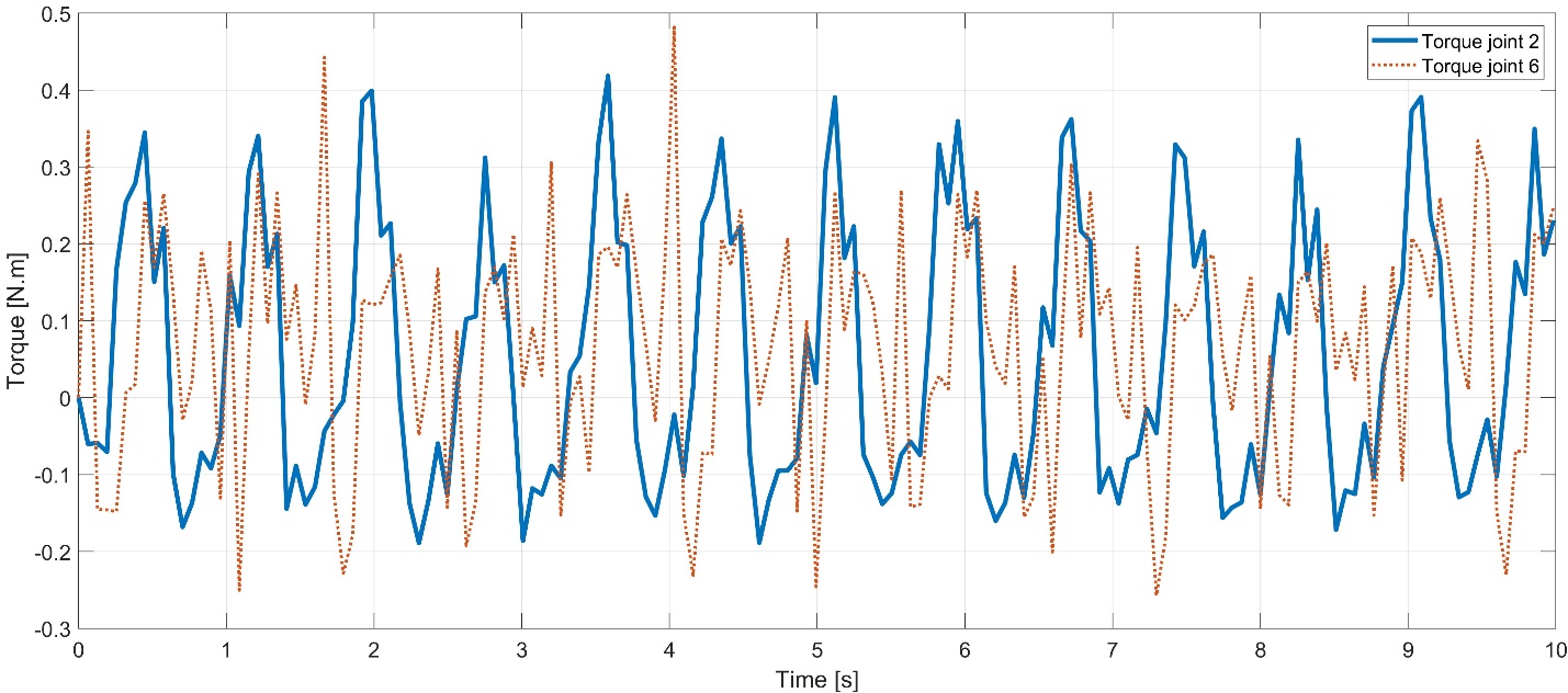 A maximum torque value was also obtained throughout the measurements on all joints. This maximum torque value was requirement for choosing the appropriate motors for the actual robot. Figure 5 presents the torques of two joints during the execution of the sidewinding gait. The maximum torque is approximately 0.48 Nm for the sixth joint, which was the highest torque obtained when verifying the results of the other joints in simulations for the sidewinding and rectilinear gait modes.