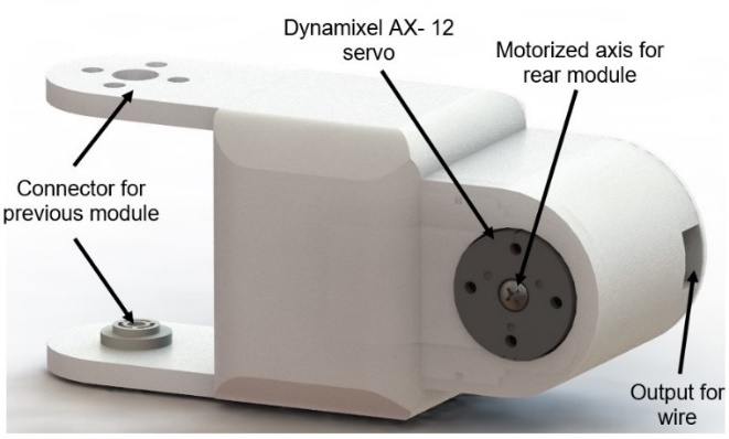 The snake robot modules were designed in SolidWorks software and then 3D printed. Each module is intended to function as a rotational joint with one degree of freedom as seen in Figure 6. The module consists of a housing, a Dynamixel servomotor, and an internal channel for a convenient disposition of the communication and power cables forming a serial bus.