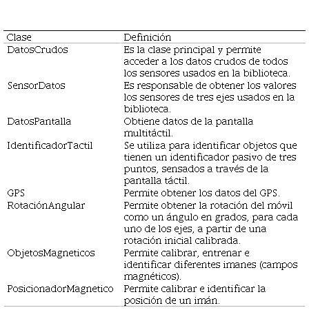 Las clases que se presentan a continuación permiten la gestión básica de sensores de tres ejes, pantalla multitáctil y GPS en el móvil: 1. DatosCrudos permite acceder a los datos crudos de los diferentes sensores, que son provistos por SensorDatos, DatosPantalla y GPS, a través de objetos de cada una de esas clases. 2. SensorDatos es la clase que se encarga de obtener los valores de los sensores acelerómetro, giroscopio, magnetómetro, y vector de rotación; todos con tres ejes. 3. DatoSensor fue creada para el manejo de los sensores tres ejes, de manera que se puedan manejar siempre, en un mismo objeto, sus valores a través de los mismos atributos flotantes: x, y, z. 4. DatosPantalla se encarga de obtener los valores brindados por la pantalla multitáctil (posición en x, posición en y, tamaño y presión), a través de una lista que crece y decrece de acuerdo con la cantidad de puntos que están siendo tocados en la pantalla. 5. PuntoTactil fue creada para el manejo de los valores provenientes de la pantalla en un solo objeto.