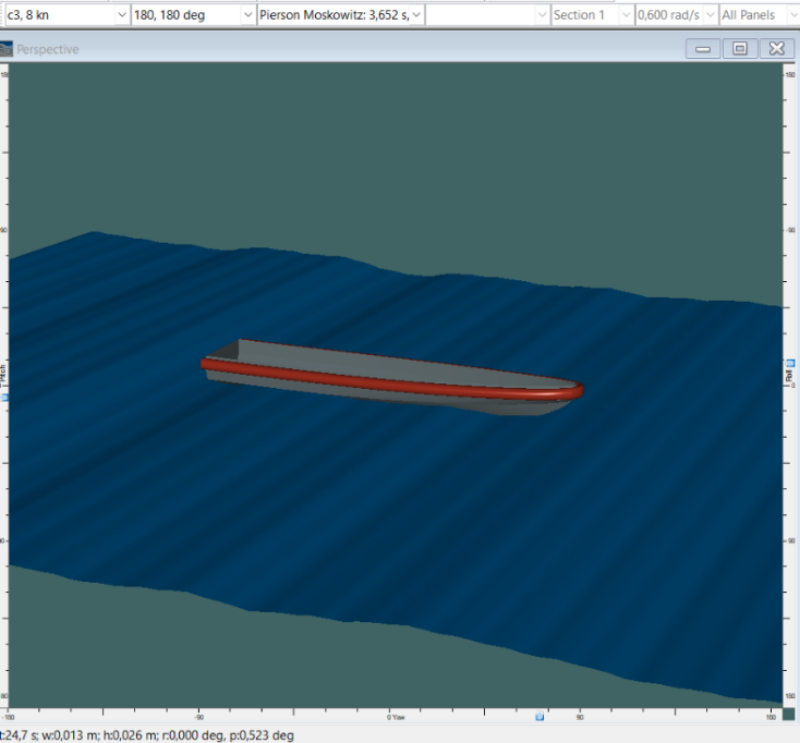 For this analysis a bridge location was considered where the vessel is steered or handled and it was located at the rear due to the characteristics of a fishing boat, the analysis was executed for an average speed of 8 knots with the center of gravity of 1. 066m, heading angles of 135°,165°,180° and a Pierson-Moskowitz spectrum that defines the wave energy distribution of a fully developed irregular sea surface about wave frequency and wind disturbance [27], [28]. There are several idealized spectra that model the behavior of the sea depending on the geographical area in which the vessel will sail, such as Pierson-Moskowitz, Jonswap, the one proposed by Torres and Lonnin, among others [29]; the Pierson spectrum was used in this study because it simulates the behavior of the fully developed sea in which the waves are in equilibrium with the wind [29]. This spectrum is used to simulate the state and behavior of the sea and to identify the dynamic changes of the vessel due to disturbances such as waves and wind. The conditions used from the Pierson-Moskowitz spectrum are: wave height = 0.534 m; wave period = 3.652 s, average wave period = 2.822 s and wind speed = 9.7 kn.