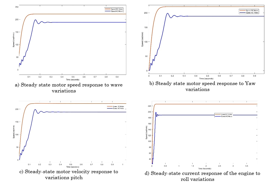 When analyzing the behavior of the boat in relation to changes in wave, yaw, roll and pitch, the curves shown in Figure 6 are obtained, where it is possible to analyze the behavior of torque, current and speed for the two motors studied.