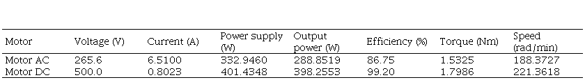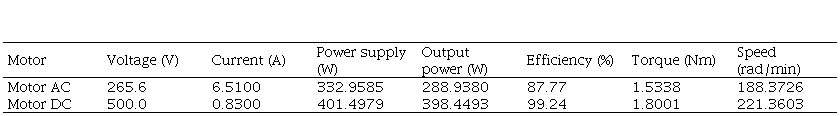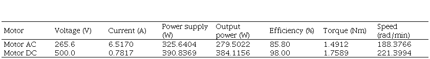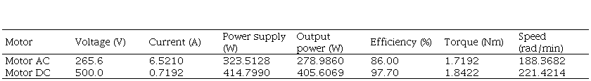 Finally, from the input and output power calculations, the efficiency of the motors presented in Tables 2-5 is obtained, where it is concluded that the DC motor is more efficient than the AC motor in all the cases of study.