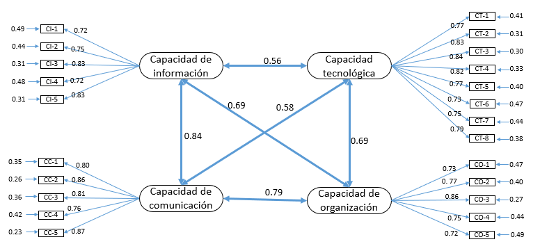 El constructo capacidad de información, fue medido a través de cinco variables observadas (Figura 1), en el que las variables CI3 (descarga el archivo seleccionado de la búsqueda hecha en su dispositivo portátil), CI5 (utiliza la información encontrada para apoyar el desarrollo de sus labores) y CI2 (utiliza palabras claves para facilitar la búsqueda de información en Internet), presentaron mayor carga factorial, 0.83, 0.83 y 0.75, respectivamente. Según López-Gil y Sevillano [53] se percibe a los universitarios en un nivel avanzado en procesos de navegación, búsqueda y filtro de información básica, pero pueden presentar dificultades en la búsqueda de información científica en bases de datos en línea, como Google Scholar o Library [54].