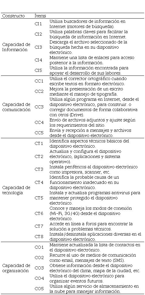 La capacidad de organización incluye las habilidades del estudiantado para ordenar la información proveniente de dispositivos electrónicos [17] y la capacidad tecnológica se define como el manejo apropiado de los dispositivos electrónicos para el mantenimiento y la solución de problemas [20].