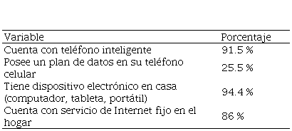 La posesión de dispositivos móviles y electrónicos presentó una tenencia de 91.5% para teléfono inteligente y 94.4 % para otros dispositivos electrónicos como computadores de mesa, portátiles o tablets (Tabla 2); valores similares a los encontrados en otros centros universitarios en países latinoamericanos [43]–[45], en los que se destaca que la tenencia de dispositivos electrónicos ha aumentado un 10 % en los últimos cinco años [46]. El uso de estos dispositivos ha mejorado las habilidades digitales de los estudiantes universitarios, aunque no todos poseen habilidades sobresalientes ni carecen por completo de las mismas, al encontrar diversos niveles de habilidad [47]. Al comparar con el promedio nacional se tiene que por cada 100 habitantes hay 129 dispositivos móviles [48]. Asimismo, el 39 % de la población nacional tiene acceso a Internet móvil [49]; aspecto que denota un menor uso y conectividad a Internet en estos dispositivos por estudiantes universitarios.