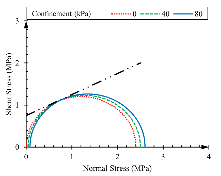 Stress states at failure from compression tests were represented by Mohr’s circles as can be shown in Figure 7, which includes the failure envelope according to the Mohr-Coulomb failure criterion given by (1). In this criterion, is the shear stress at failure, c is cohesion, σ is the normal stress to the failure plane, and ϕ is the shear strength angle.