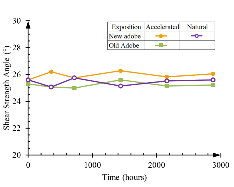 Similar graphics for different adobes, exposition period and type of weathering were plotted and estimated the corresponding shear strength parameters, ϕ and c. Figure 8 presents the comparison of the different shear strength angles. It is evident that this parameter was not affected by the duration of the exposition, neither by natural nor by artificial regime. As a result of the acceleration in the weathering process, new adobe exposed to artificial conditions had a very little increment in the shear strength angle compared with the same adobe but naturally exposed. It is important to realize that old adobe retained the same shear strength angle despite the long and unfavorable conditions of natural weathering. From a practical point of view, the shear strength angle is 25° for old and new adobe, regardless the exposition conditions.
