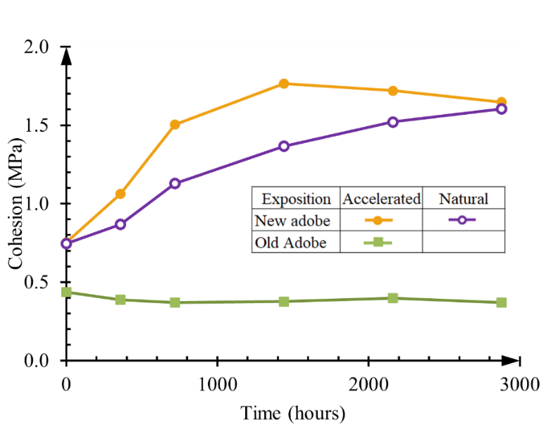 The patterns observed in the compressive strength analyzed in the preceding section, are reflected in the cohesion parameter (Figure 9). This observation indicates that the growth in the strength is primarily governed by an increase in the cementation of the clay minerals by cause of exposition to natural or artificial ageing. Old adobe is nearly insensitive to accelerated exposition because after approximately 300 years of natural exposition to weathering, almost 3000 hours of additional accelerated exposition are insignificant. Nevertheless, prolonged exposition to ambient conditions without preventive or reconstructive interventions seriously diminished the cohesion of adobe units. Reduction in cohesion values after 1500 hours of accelerated exposition evidenced in new adobe samples could be due to the same mechanism that occasioned the gradual reduction of cohesion in old adobe after many years from its construction until the present.