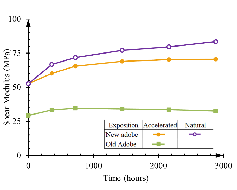 Comparing shear moduli of new adobe against old adobe, it is clear the significant difference along the entire period studied. Moreover, the ratio between new-adobe modulus and old-adobe modulus from samples artificially weathered is around two for all the exposition periods. The substantial reduction of the modulus observed in old-adobe samples could be caused by the careless conditions of the structure throughout the last century during which the walls were non-protected with a roof.
