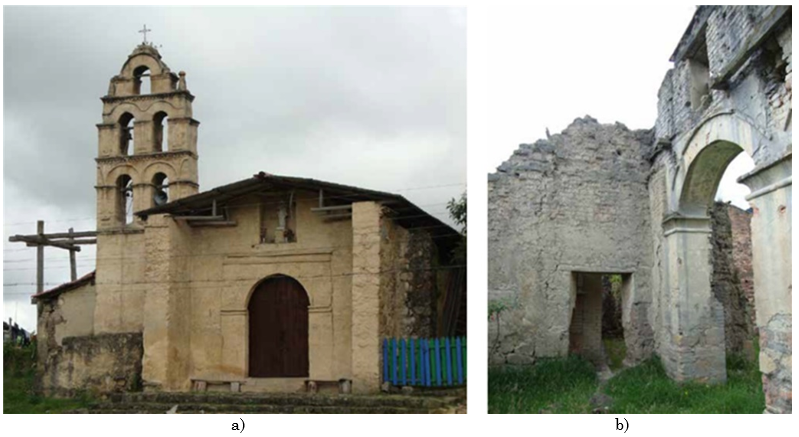 Construction of buildings using adobe and rammed earth were spread along South America during the European domination [28]. In Colombia, approximately 80 % of 1133 national monuments from the colonial period were constructed in adobe and rammed earth [29]. Mendoza [30] describes the different religious architectonic styles during the Spanish domination in Colombia. Ruiz et al. [28] synthesize the way in which during this period many of the so-called doctrinal chapels were built using adobe and rammed earth. In the antique center of Tausa (a small municipality near Bogotá, Colombia) there is a chapel of colonial style, which was built more than 300 years ago. The chapel retains its original adobe structure of single nave with access framed in a semi-circular arch and a lateral belfry. Its atrium is built in stone, forming four staircases that lead to the street. According to the current structural preservation state, the building can be divided into two parts. The frontal sector presented in Figure 1a) is currently in use and is composed of the nave built in masonry, adobe, rammed earth, and collar roof. The rear sector in abandoned conditions as can be seen in Figure 1b) corresponds to the ruined walls of the presbytery and two lateral areas, of which it is unknown its use. A description of the architectonic distribution, constructive technique and physical, mechanical, and chemical characteristics of the materials can be found in [31].