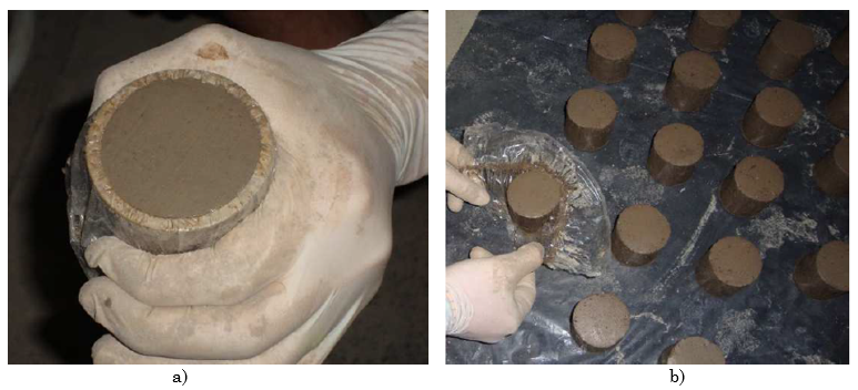 The experimental program was carried out on two groups of materials. The first one corresponds to adobe samples recovered from the rear sector of the chapel (old adobe). 15 complete adobe units and 24 fragments (Figure 2) composed old adobe samples. The second group was obtained from a soil deposit located in the area close to the chapel (new adobe). Three soil deposits in the locality were preliminarily studied by performing soil classification tests and the most similar soil to the old adobe was the chosen one. Only results from the selected soil deposit are presented in this paper. With the new adobe, 60 samples were prepared by compaction in cylindrical molds under controlled water content. Then, they were extruded from the mold and left to air-drying with no action of direct sunlight for 45 days (Figure 3). Compaction of samples was carried out to simulate the methods employed by ancient construction workers in the production of adobe walls. For this reason, modern procedures such as Proctor compaction were avoided to preserve the authenticity of the compaction process. The moisture conditions for compaction were those necessary for better workability, mirroring the practices of traditional construction [32]. This procedure aimed to obtain samples with similar characteristics of adobe units made with this conventional technique. A comparison of the physical characteristics of old adobe and new adobe samples are presented in Table 1. Results from old adobe are like results previously obtained on samples of the same chapel by [32]. However, plasticity limits are slightly lower than the results found in the present work.