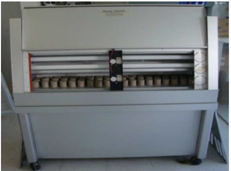 Cylindrical samples from old adobe were obtained from adobe samples by using a core extractor. An accelerated weathering tester QUV-SE [33] simulates the effect of ambient exposition. Figure 4 illustrates the equipment with a group of samples ready to be exposed to weathering. The equipment is capable of controlling irradiance by a closed-loop control and uses eight UVA-340 lamps simulating the sunlight from 365nm down to the solar cut-off of 295 nm. In addition, the apparatus has a condensation mechanism to simulate outdoor moisture attack by heating a water reservoir to produce a vapor that maintains a 100 % relative humidity. Radiation and condensation alternate cyclically in programmable periods. Exposition of materials to this artificial regime produces degradation in a similar way that natural ambient conditions. Proportionally time factor between natural and artificial exposition is not constant since it depends on several variables that are not fully controlled (e.g., tested material, variation in natural conditions, variables capable of controlling in the equipment). The standard ASTM G154-16 [34] covers the principles and operating procedures for apparatuses designed for UV exposition of non-metallic materials.