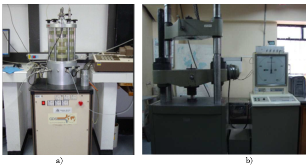 Mechanical tests on the samples were done by using the GDS triaxial testing apparatus shown in Figure 5a [35]. The system allows controlling confinement pressure and vertical stress. A universal compression tester machine was used for unconfined compression tests on cylindrical samples (Figure 5b). Additional equipment and accessories include scale, oven, sieves, soil classification instruments and compaction molds.