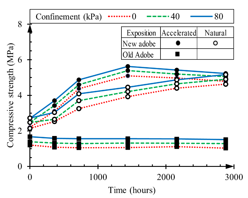 The natural-exposed new adobe gradually increases its strength, since during the period studied, the unconfined compressive strength raised from 2.2MPa up to 4.4 MPa with a rate of strengthening decreasing with time. On the other hand, artificially exposed new adobe showed an initial rapid increase in the strength, followed by a slight reduction of this property. By comparing natural and accelerated exposition curves from new adobe, naturally exposed curves could represent the first stages of accelerated curves, that is, 2880 hours under natural exposition could be reproduced by approximately 720 hours under artificial conditions. This ageing factor of four is approximated and only should be representative of the conditions in which the samples of this new adobe were subjected to ambient conditions. The effect of the confinement is reflected in the three set of samples: the higher the confinement stress, the greater the compressive strength is. Additional compressive strength caused by the applied confinement is practically constant irrespective of the adobe, weathering regime and exposition time.