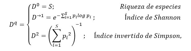 Donde corresponde al número de especies observadas en un punto o área determinada y es la abundancia relativa. Nótese que , debido a que, en un área o punto determinado, se tienen repeticiones de conteos de especies. Además, cuando se obtiene la diversidad de todas las especies, para especies “típicas”, y cuando se obtienen las especies dominantes. Se realizaron estimaciones para los índices de diversidad de Hill (o números de diversidad de Hill), intervalos de confianzas, trazos de curvas de rarefacción y extrapolación con respecto al tamaño de muestra de referencia y muestra completa, respectivamente, de las aves registradas en los diferentes fragmentos de estudio a partir de las expresiones propuestas en [28]. Las estimaciones de la diversidad de Hill se llevaron a cabo usando remuestreo Bootstrap con 1000 simulaciones [29], de tal manera que se obtiene la diversidad para el número de especies observadas a través de interpolación y extrapolación de datos.