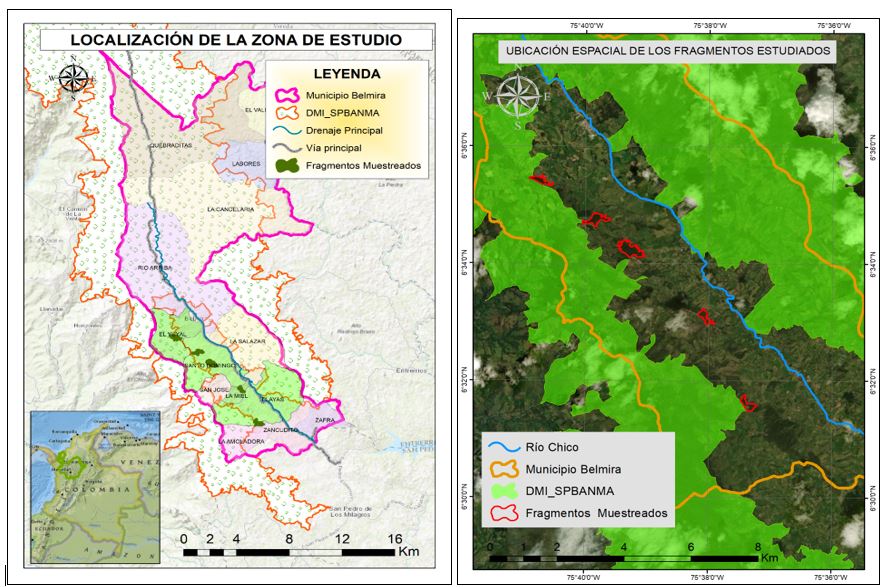 El municipio de Belmira está localizado en la cordillera central de Colombia, departamento de Antioquia, a una altura que oscila entre los 2400 y 3000 MSNM, y una temperatura promedio de 14 ºC. En la Figura 1, se observa la localización de los fragmentos de bosque andino estudiados (imagen de la izquierda) y la ubicación espacial de los mismos (imagen de la derecha). Estos fragmentos de bosque estudiados se encuentran ubicados en la zona con función amortiguadora de un área protegida bajo la figura de conservación denominada “Distrito de Manejo Integrado y Sistema de Páramo y Bosque Altoandino del Noroccidente Medio de Antioquia (DMI SPBANMA)” y pertenece al Sistema Nacional de Áreas protegidas de Colombia (SINAP).
