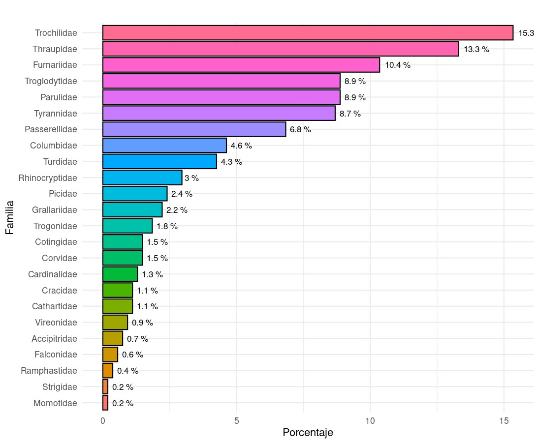La distribución de porcentual de especies identificadas y clasificadas en las familias se puede observar en la Figura 2.Se evidencia que las tres familias de aves con el mayor número de especies registradas corresponden a Trochilidae de los colibríes con un 15.3 %, seguida por la familia Thraupidae de las tángaras con un 13.3 %, y, por último, en este grupo de familias identificadas como las más frecuentes se encuentra la Furnariidae de los trepatroncos y hojarasqueros con un 10.4 %. Estos resultados muestran que las familias con más individuos encontrados en la zona son aquellas que tienen mayor riqueza de especies en Colombia [19].