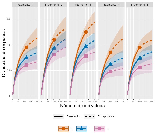 En la Figura 3, se observa el comportamiento de las estimaciones de los números de Hill ( a través de las curvas de acumulación enrarecidas y extrapoladas por fragmentos, permitiendo evidenciar las diferencias en la diversidad de las especies, a lo largo de la acumulación de individuos observados [28]. Notamos que el Fragmento 3 posee la mayor diversidad de especies según los números de Hill, pues las curvas tienden a estar por encima de las correspondientes en los otros fragmentos.