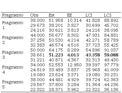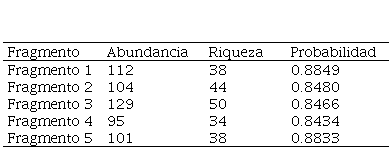 Los valores asociados a la probabilidad de observar una especie, abundancia y riqueza observada, en cada uno de los fragmentos de bosque andino analizados se presentan en la Tabla 1. Notamos que el fragmento 3 es el que presenta mayor abundancia y riqueza de especie observada con valores de 129 y 50, respectivamente. Sin embargo, el fragmento 1 es el que presenta mayor probabilidad de observar una especie.