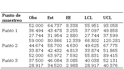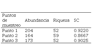 Tomado como referencia los puntos de muestreo, podemos observar que, en promedio e independiente del fragmento muestreado, el punto 2 es el que posee mayor riqueza de especies, con una riqueza estimada de 59 y una probabilidad de observar una especie de 0.8667 (ver Tabla 3). Note que este resultado va de la mano con lo expuesto por [31], donde se afirma que las partes intermedias tienden a proporcionar la mayor riqueza de especies debido a que estos se convierten en puntos de transición.