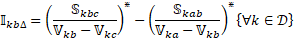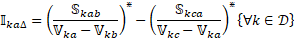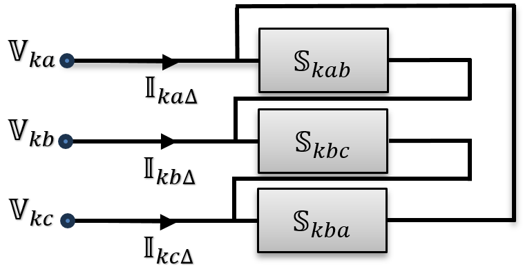 Where Ika∆, , Ikb∆ and Ikc∆ represent the net current absorption for a triangle load connected at bus k; and Skab, Skbc, and Skca, denote the complex power consumption between each pair of phases on bus k.