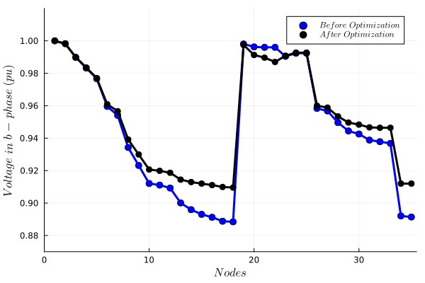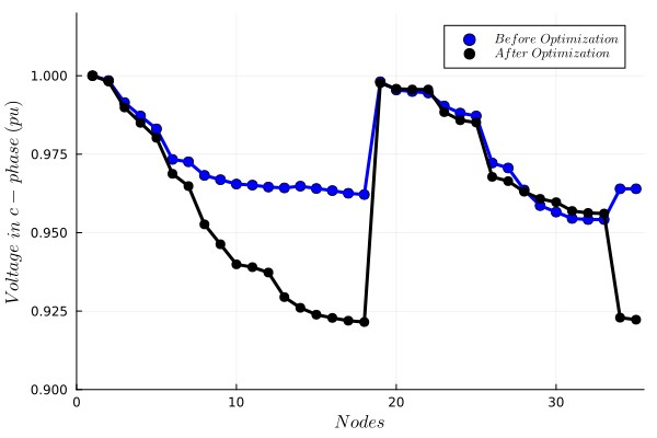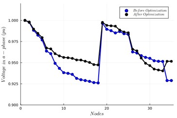 To demonstrate the positive effect of power losses minimization on the electrical performance of the studied three-phase distribution network with respect to power savings, the behavior of the per-phase voltage profile is shown depicted in Figures 6-8.