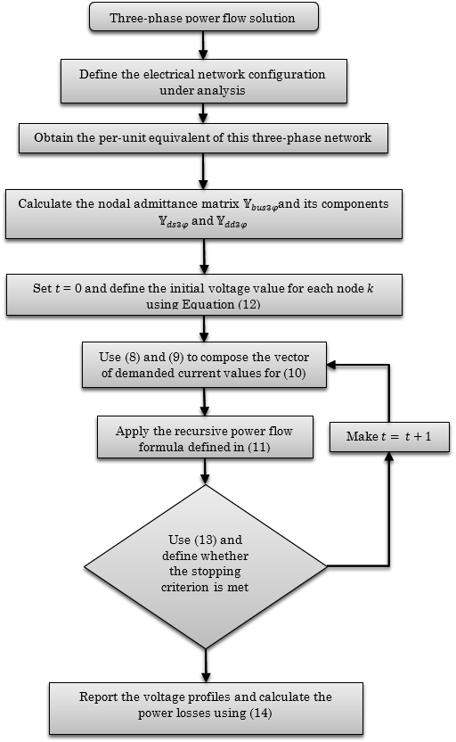 Where is the iteration counter, and each component of Itd3φ is calculated using (10) Note that (11) is known in the literature as the successive approximation powerflow method [12]. The iterative process starts when, t = 0 setting each component of the vector V0d3φ as V0k3φ= Vs3φ, for k = 2,3,…,n with Vs3φ defined as follows: