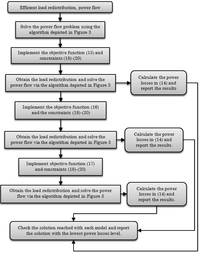 Figure 4 illustrates the general implementation of the proposed load redistribution model and its connection with the power flow problem presented in Figure 3.