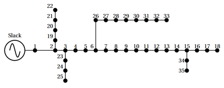 To demonstrate the applicability of the proposed methodology to reduce power losses in unbalanced three-phase distribution networks, which employ a hybrid optimization approach based on the power flow formulation and the mixed integer convex model (15) - (20), the three-phase equivalent of a single-phase 35-bus network is used. Figure 5 presents the nodal interconnections of this grid.